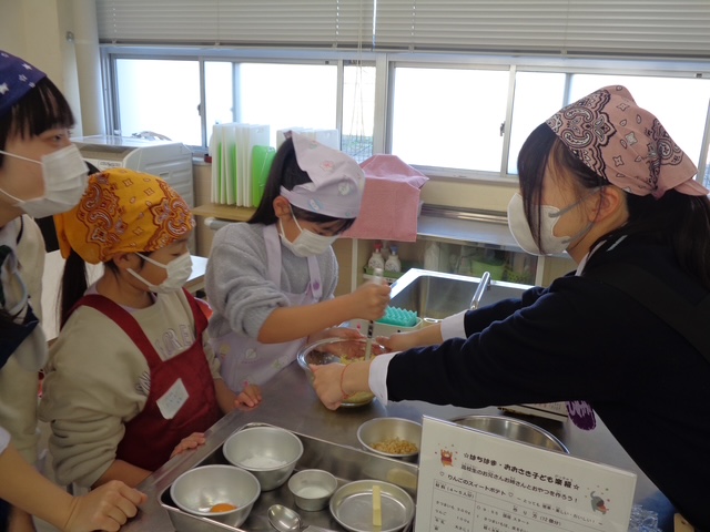 11月22日の「はちはま・おおさき子ども楽級」では、「りんごとさつまいも」を使用したお菓子を作りました。また前日には、清潔な環境で調理ができるように大掃除をしました。調理台・流し台のほか、オーブンやコンロまでピカピカに磨き、小学生を迎える準備をしました。