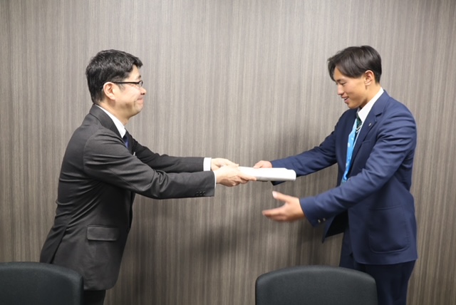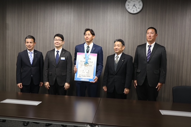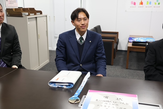 この快挙を中村教育長へ報告するために岡山県庁を訪れ、賞状やメダルを披露させていただきました。井上さんは「絶対に日本一を取る」という思いで跳び、中国高校記録を更新する15メートル63センチで優勝。大学進学後も高いレベルで競技を続け、世界で戦える選手を目指すそうです。